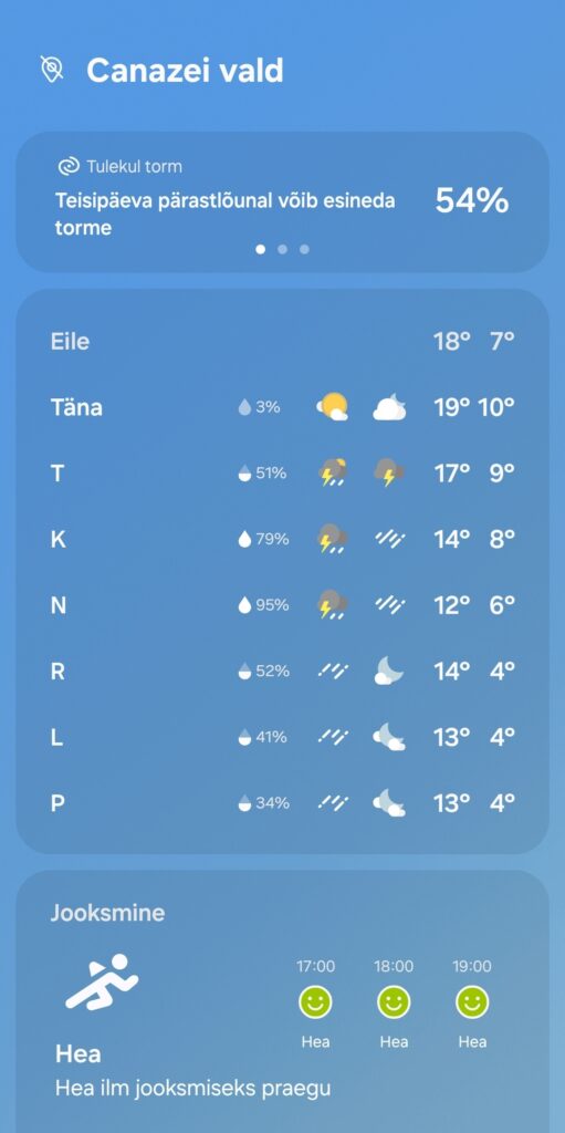 Koht kus hetkel olen, siin on kell 16 õues temperatuur 31 kraadi. Nüüd jälle veidi harjumatult soe, aga vähemalt pole 40 – need kuumad on selleks suveks loodetavasti möödas.