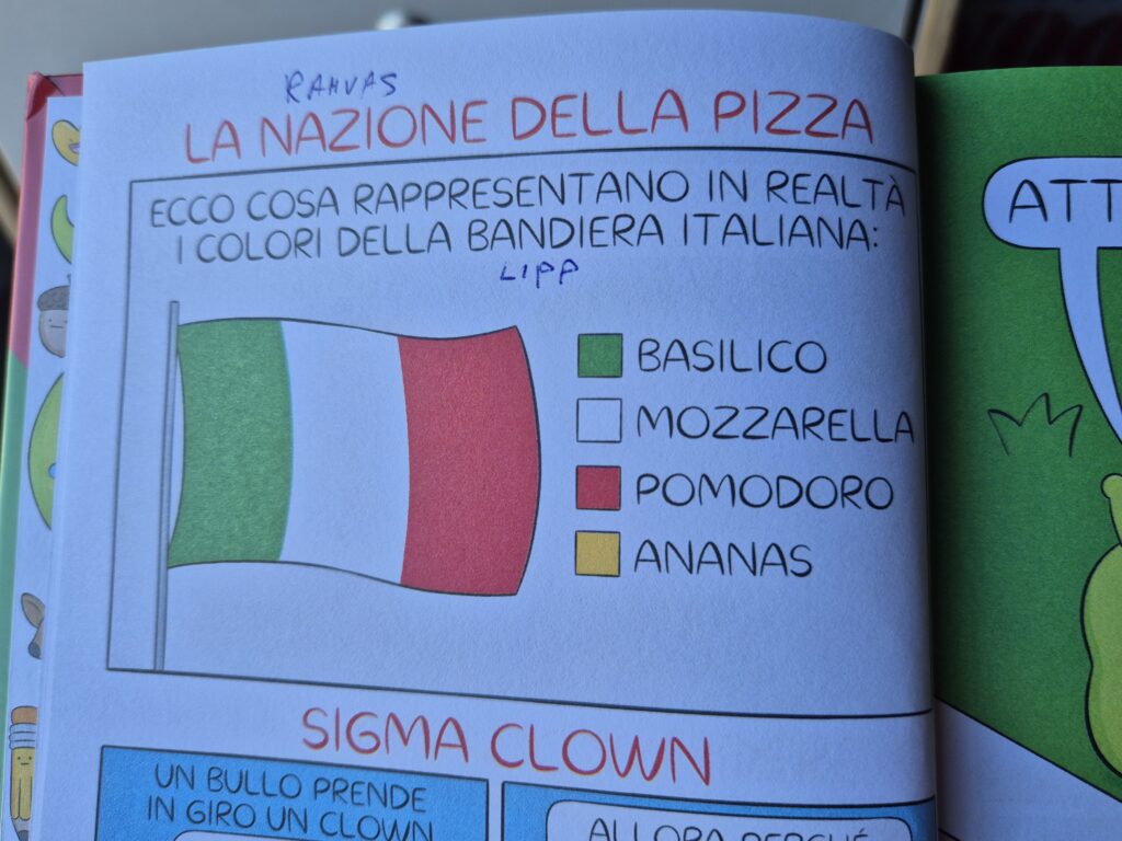 Esimene leht, mis ette tuli, kui raamatu avasin, oli pealkirjaga “Pitsa rahvas”. Sisu tõlgituna on midagi sellist: “Siin on tegelikud Itaalia lipuvärvide tähendused: [roheline] basiilik, [valge] mozzarella, [punane] tomat, [kollane] ananass”. Mind pani see kohe muigama, kuna tean selle nalja tausta. Itaalia lipul pole kollast värvi nagu ka Itaalia pitsal pole kohta ananassile! Kui Itaalias küsida pitsa peale ananassi, siis võib peksa ka saada (nali muidugi, või kas ikka on?).